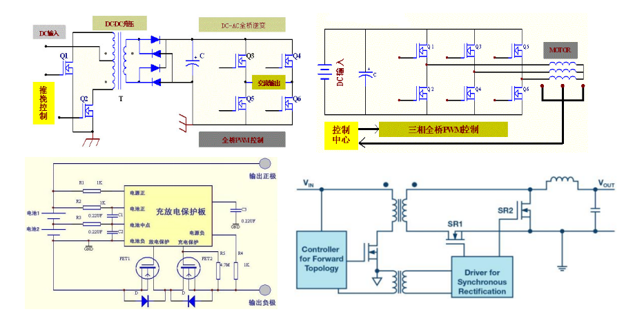 (1)儲能電源/太陽能控制器/逆變器/UPS等電源的DC-DC升壓結(jié)構(gòu)使用推免結(jié)構(gòu)或者半橋、全橋結(jié)構(gòu)。