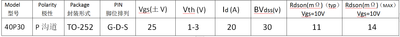 為了解決電子工程師在設(shè)計電源的時候能提高過流保護(hù)的功能,飛虹電子研發(fā)了型號為40P03的MOS管,采用P溝道溝槽工藝,封裝形式為TO-252,腳位排列是G-D-S,mos管廠家其他參數(shù)請看下圖: